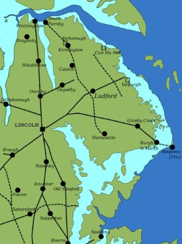 the North Sea) and the route from Lincoln (a cross roads of the Fosse Way